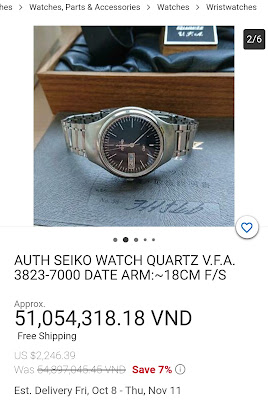 (3) Giá trị một vài chiếc Quartz cổ đời đầu loại máy 3823 (1971-1973), đang rao bán quốc tế, model này được sản xuất khoảng 70-100K Yên/chiếc = khoảng 170 triệu VND ngày nay, chiếc: